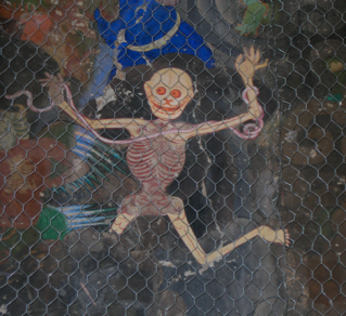 チベット寺院の壁画に描かれた骸骨。チベットにおいて、死は、決して喪失を意味するわけではなく、次の生への重要なステップと考えられている。